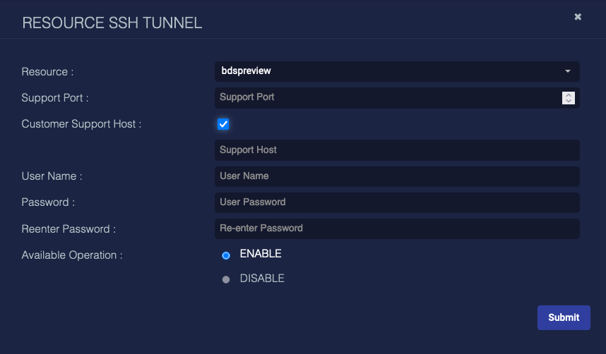 Click the Submit button to establish the SSH tunnel. Alternatively, you can click the button in the upper right corner to dismiss the dialog box and discard all changes.