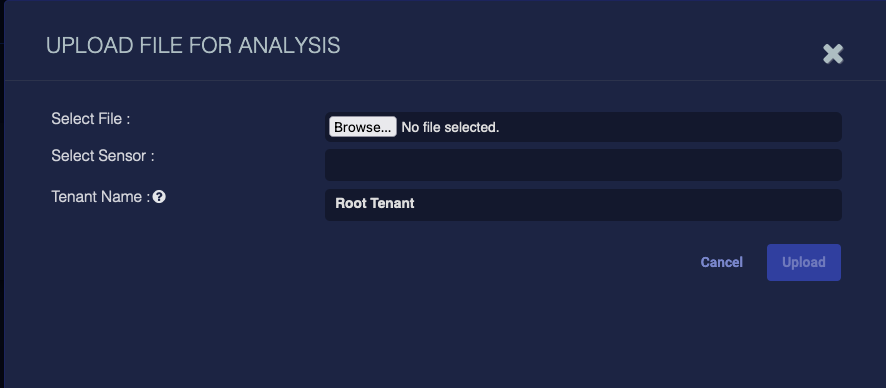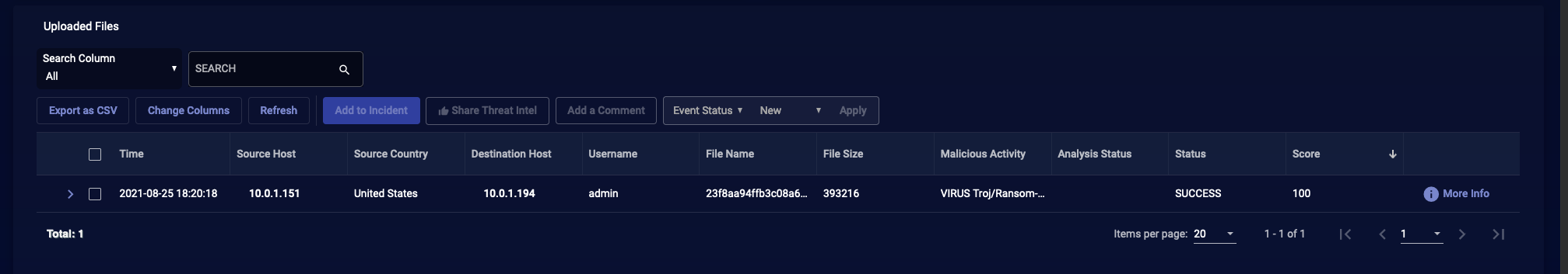Depending on the files you uploaded and the sensor's workload, it can take up to 10 minutes to complete the analysis. Entries in the Uploaded Files table support the same options as the events table, described below.