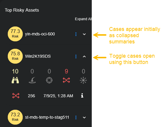 Top Risky Assets Panel – Lists collapsible capsule summaries of the top risky assets by score with multiple drilldowns for further analysis.