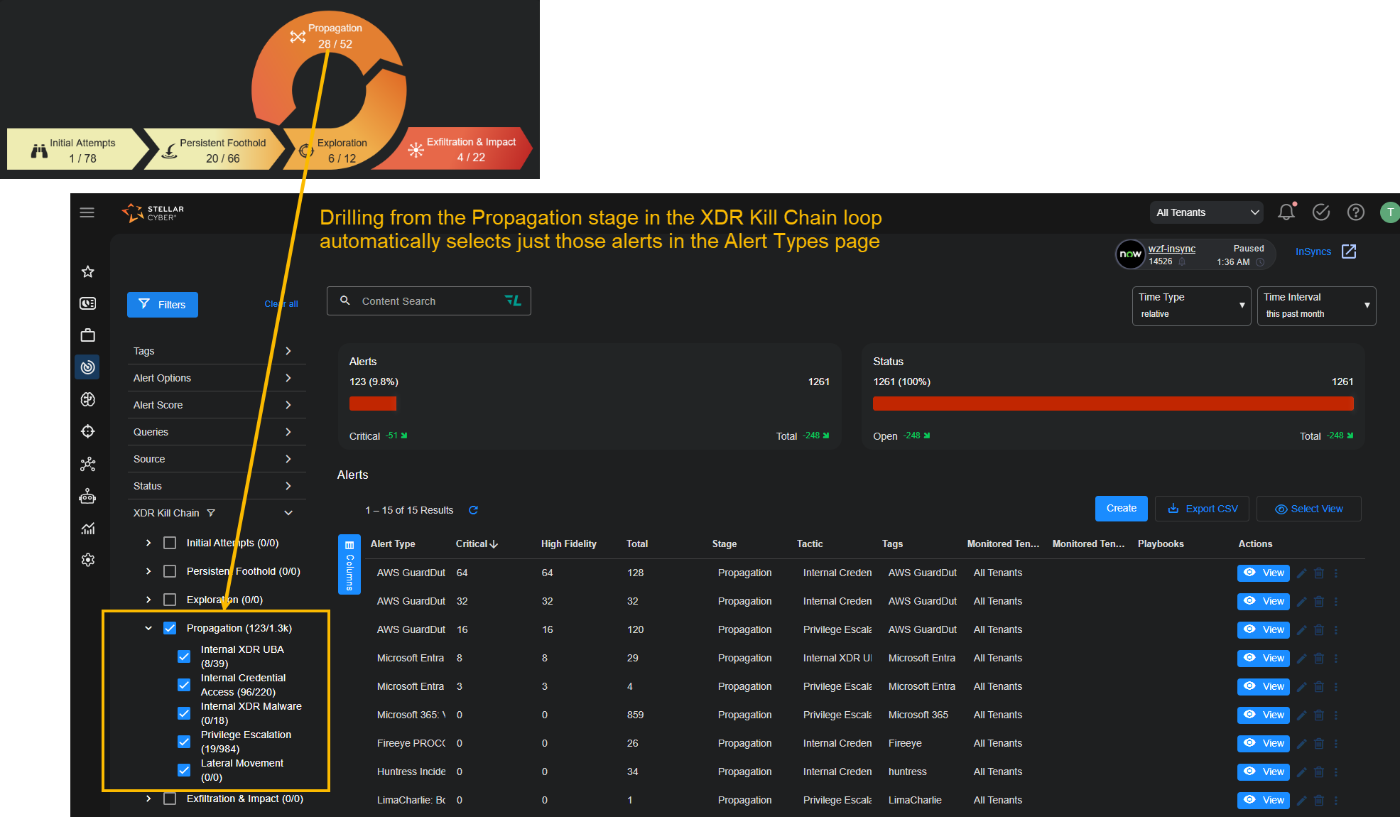 You can select any of the stages in the XDR Kill Chain loop to drill to the Alerts page with a display filter automatically applied so that just the alert types at the selected stage are displayed, as illustrated in the figure below.