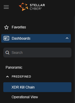 If you have not changed your home page by selecting the Set as homepage menu item from the upper, right-most icon, you can get back to the XDR Kill Chain dashboard by selecting the Stellar Cyber logo at the upper left of the display or by selecting the Dashboards | PREDEFINED | XDR Kill Chain menu item.