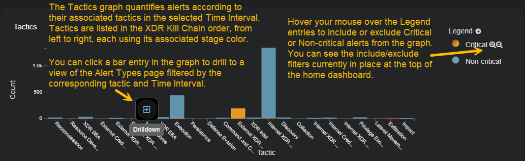 The Tactics graph at the bottom of the XDR Kill Chain dashboard quantifies alerts by their associated XDR Kill Chain tactic within the selected filters.