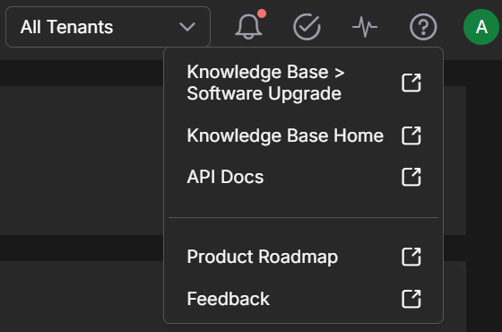 Select the question mark icon in the top-right menu bar to open the Help menu. From here, you can access context-sensitive Knowledge Base topics, the Knowledge Base home page, API documentation, and a form for leaving product feedback.