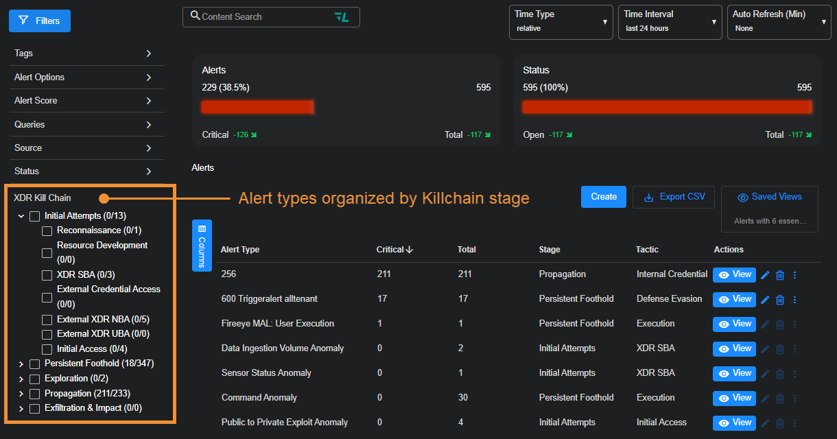 There are many different types of alerts available in Stellar Cyber, organized by XDR Kill Chain Stage, Tactic, and Technique, with each focused on a specific type of security threat. The figure below shows the organization of the alerts in the Alert Types page.