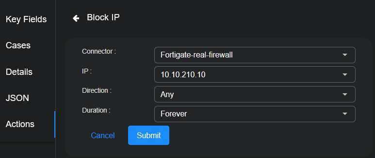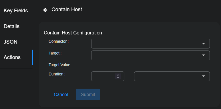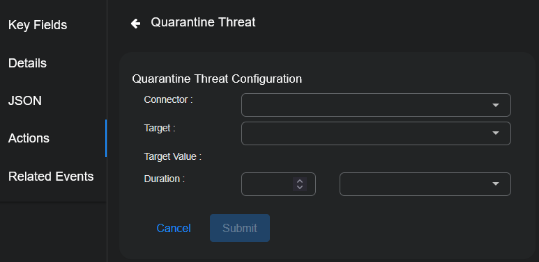 Click Submit. A quarantine on the target is immediately triggered from the SentinelOne service associated with your connector.