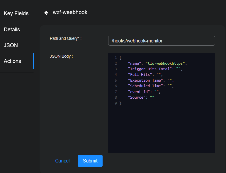 (Optional) When the Webhook Responder is triggered manually, you can edit the Path and Query and the JSON Body when you issue the action.