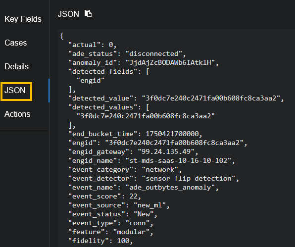 When you apply the detections filter, Stellar Cyber displays only the key-value pairs with field names that begin with xdr_event.