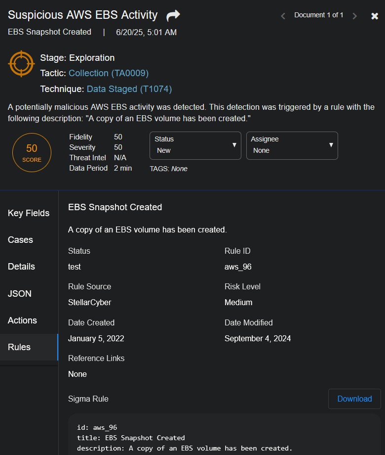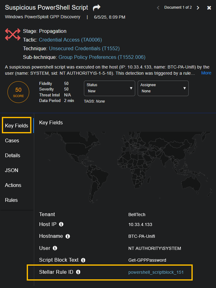To get the Knowledge Base description for rule-based alerts, in the Key Fields, click the Stellar Rule ID link, for example, powershell_scriptblock_151.