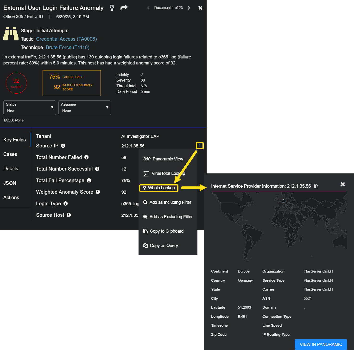 This menu option is displayed when the selected field is either a srcip, dstip, srcip_host or dstip_host and the IP address is in the public range. When applicable and you use the action, a dialog similar to below is displayed with the available lookup information.