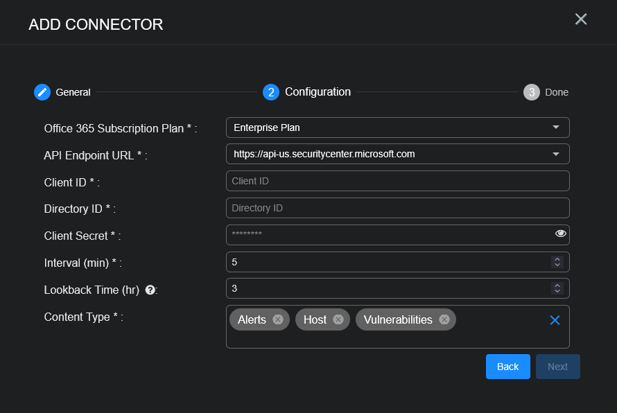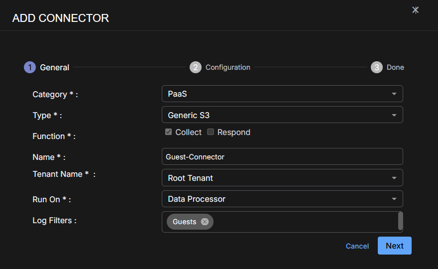 Stellar Cyber conducts a basic connectivity test for the connector and reports a success or failure result. A successful test indicates that you entered all of the connector information correctly.