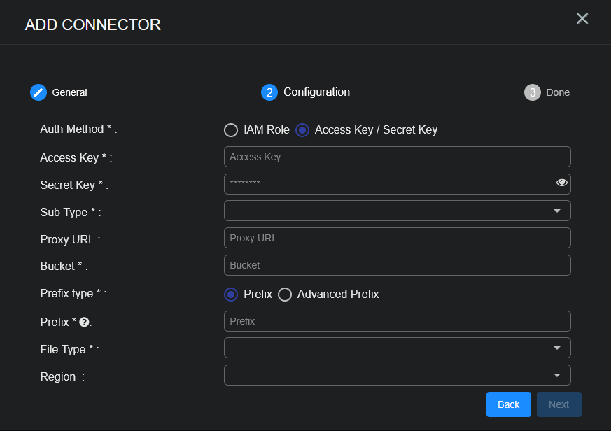 • For Access Key / Secret Key Auth Method: Access Key, Secret Key, Sub Type, Bucket, plus Prefix type (Prefix or Advanced Prefix), and File Type