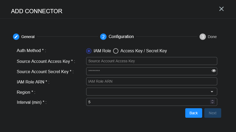 • For IAM Role Auth Method: Source Account Access Key, Source Account Secret Key, and IAM Role ARN, plus Region