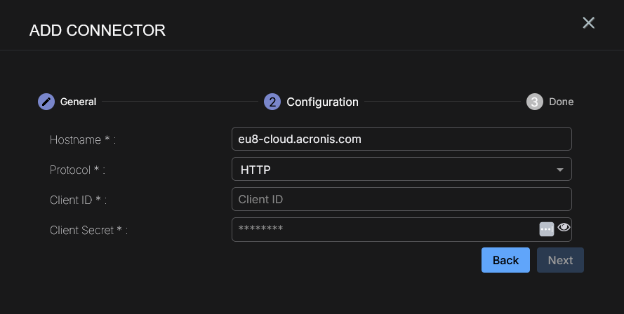 11. Enter the Hostname you noted above in Obtaining Acronis Cyber Protect Cloud Credentials.