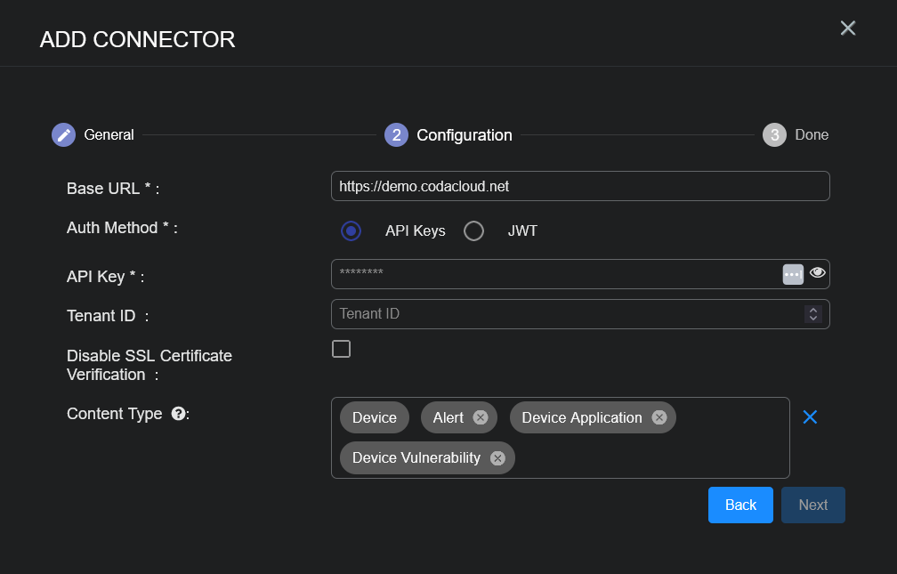 • For API Keys Auth Method: Base URL, and API Key
