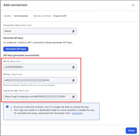 7. Copy the generated API ID, API key, and Log server URL, which will be used to add the connector in Stellar Cyber.