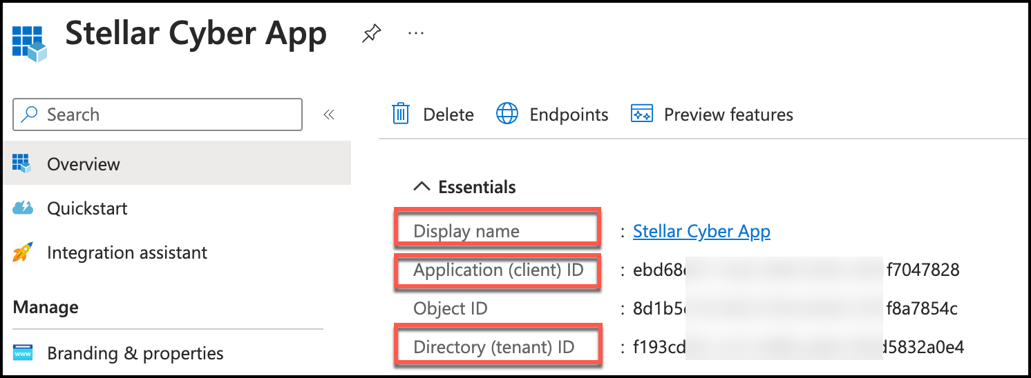 • Application (client) ID, which is the Client ID you will use to add the connector in Stellar Cyber