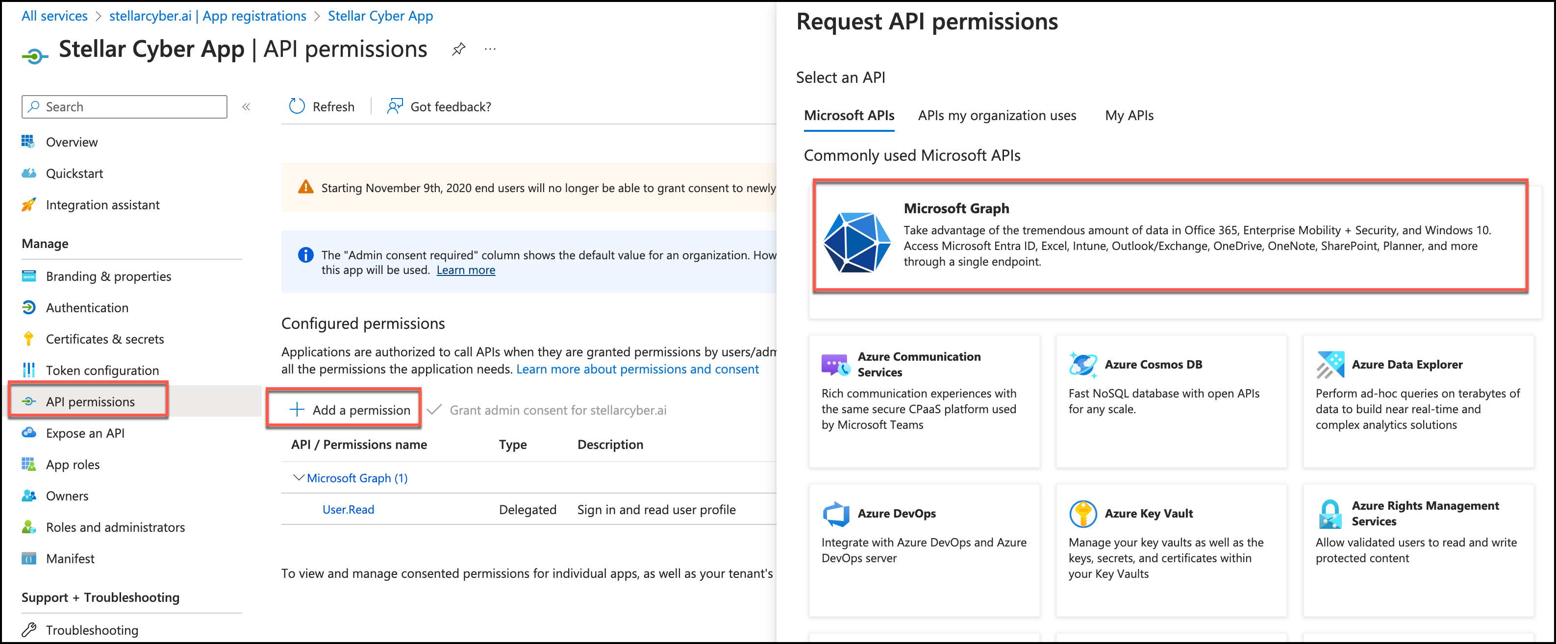 1. To set the permissions for your application, in the navigation pane under Manage, select API Permissions. Click Add a permission. The Request API permissions pane appears. Click Microsoft Graph.