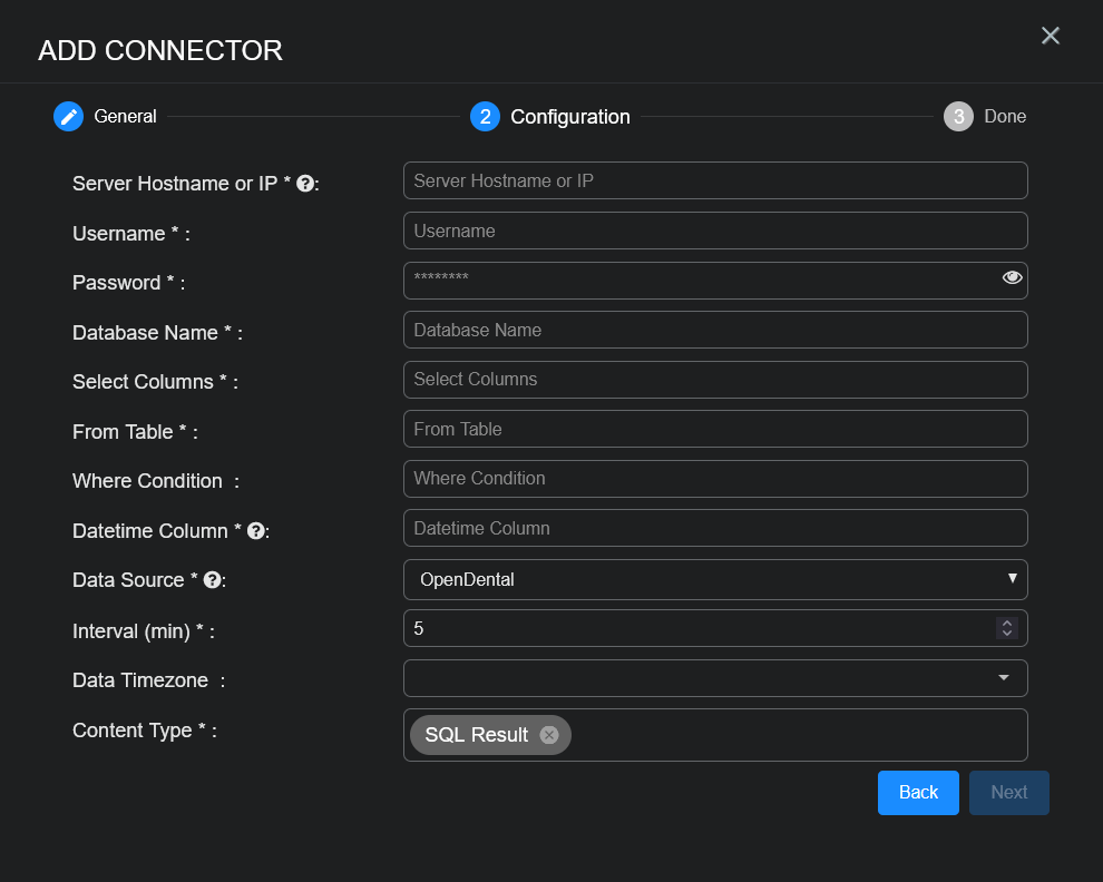 • Server Hostname or IP, Username, Password, Database Name, Select Columns, From Table, Datetime Column, and Data Source