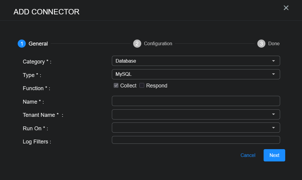 To add a MySQL connector in Stellar Cyber: