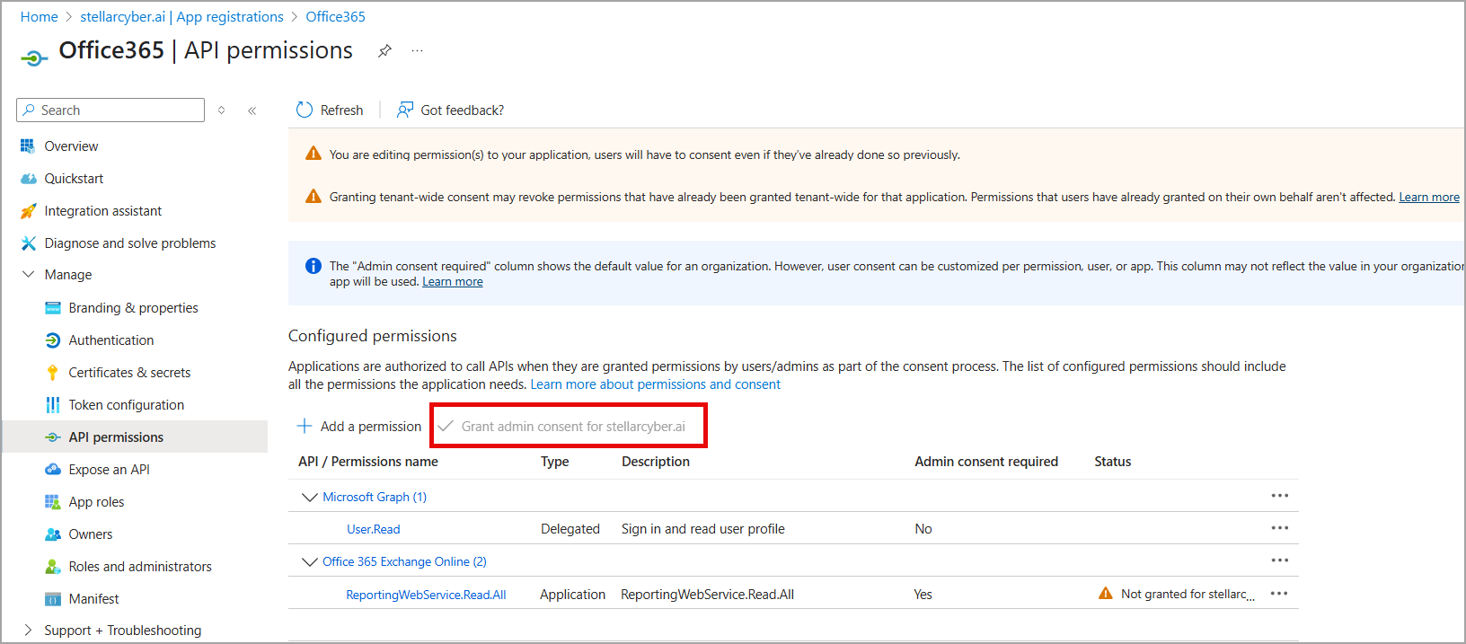 1. After adding permissions, there is a banner at the top of the API Permissions page that says the permissions require admin consent.