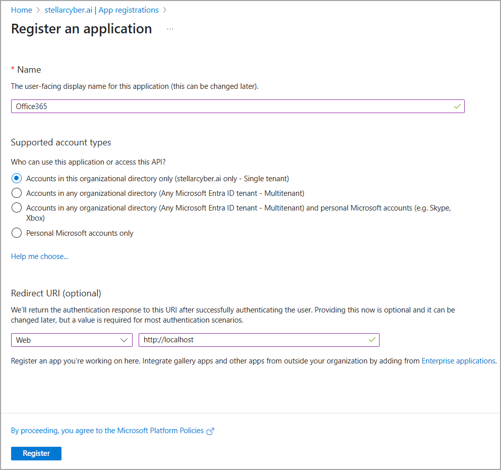 6. Choose a supported account type. For Single tenant, select Accounts in this organizational directory only.