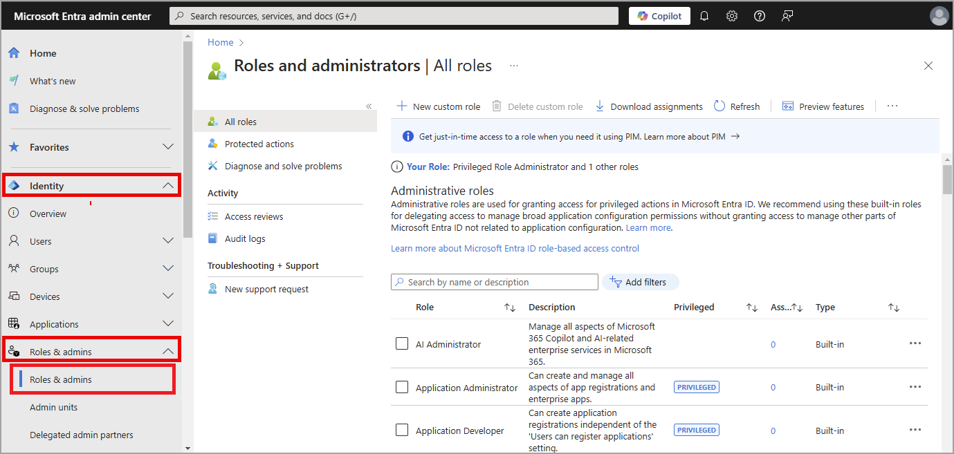 2. Navigate to Identity > Roles & admins > Roles & admins.