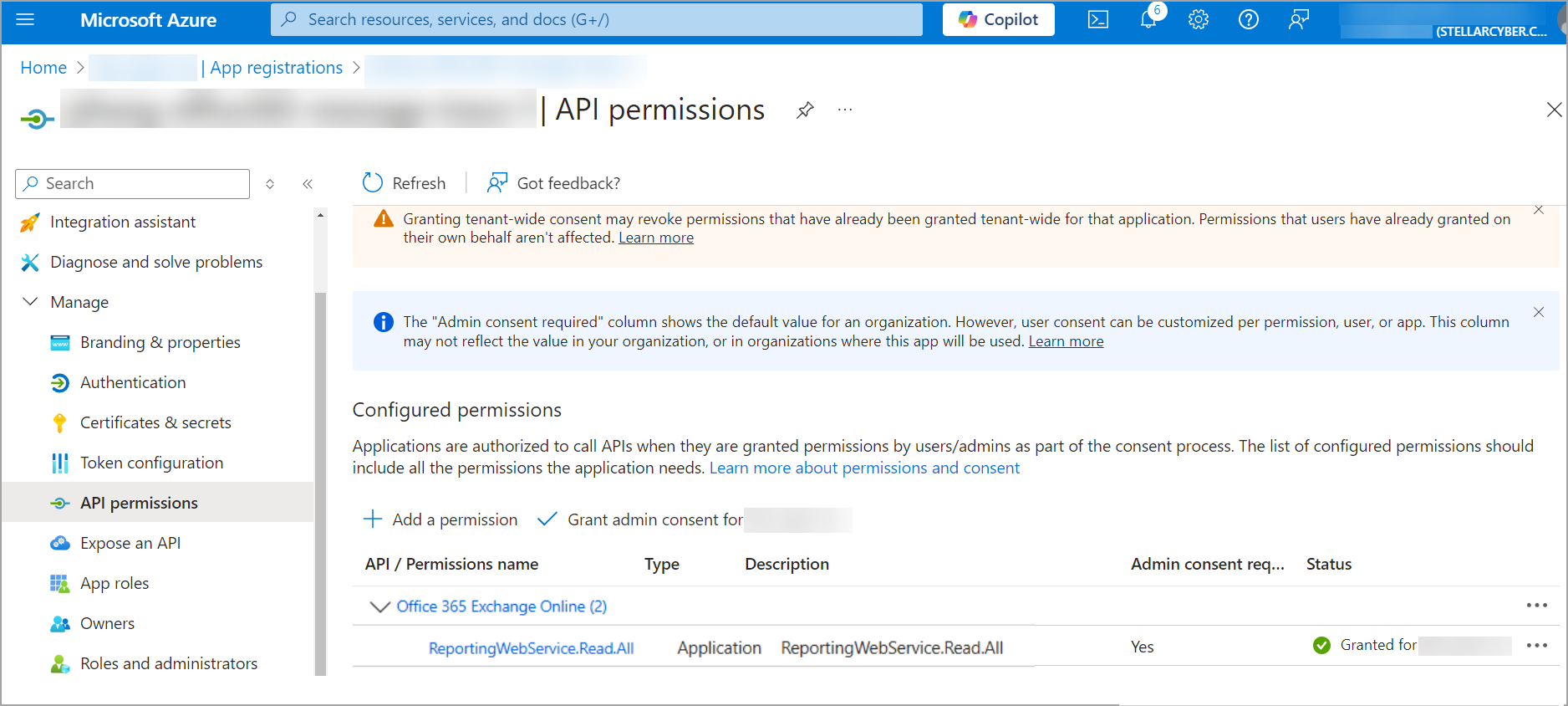 1. After granting admin consent, the status for the permissions will update to Granted for < tenant name>.