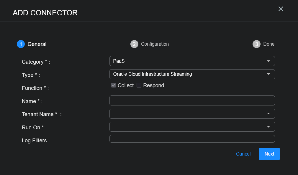 With the access information handy, you can add an OCI Streaming connector in Stellar Cyber: