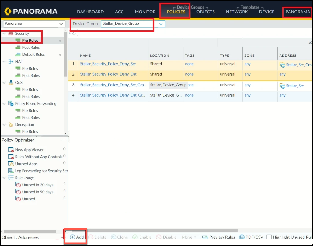 1. Under Panorama, select PoliciesSecurity > Pre Rules.
