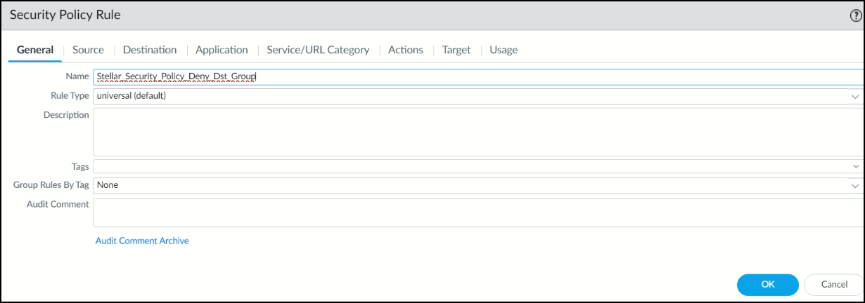13. In the Security Policy Rule screen, under the General tab, enter the Name of the policy. In this example, it is Stellar_Security_Policy_Deny_Dst_Group.