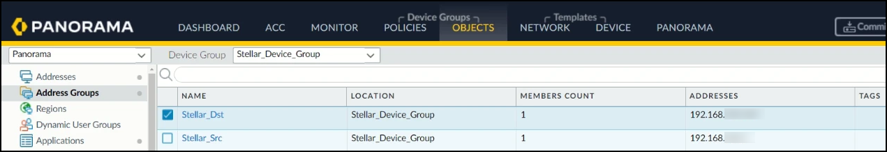 4. Check the Palo Alto firewall. In this example, the PA-VM firewall was added to Stellar_Device_Group.