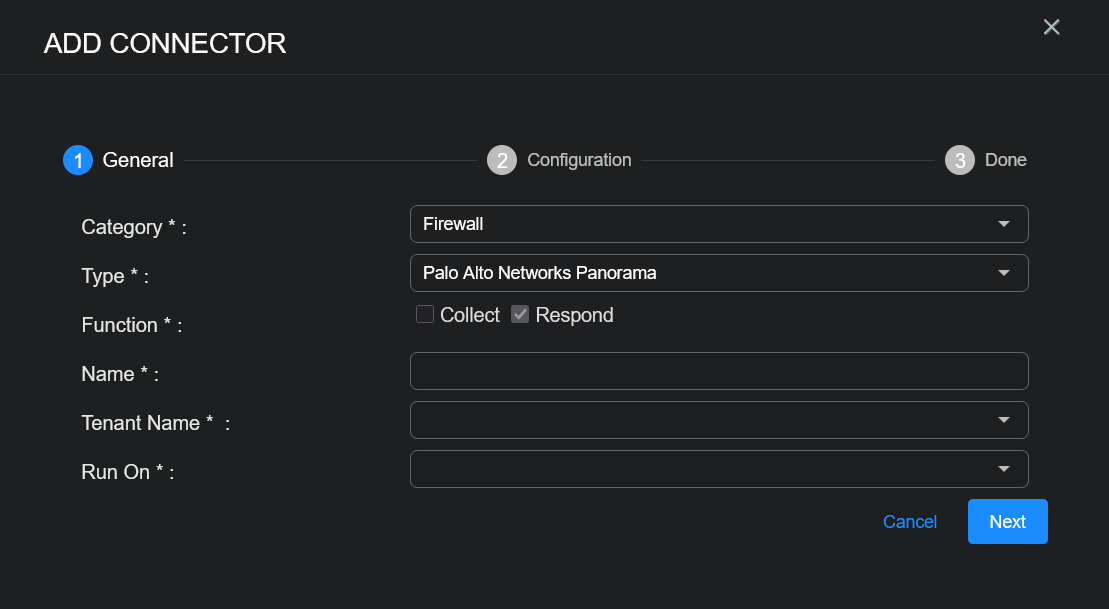 To add a new Palo Alto Networks Panorama connector: