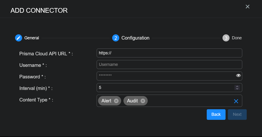 To add a Palo Alto Networks Prisma Cloud connector in Stellar Cyber: