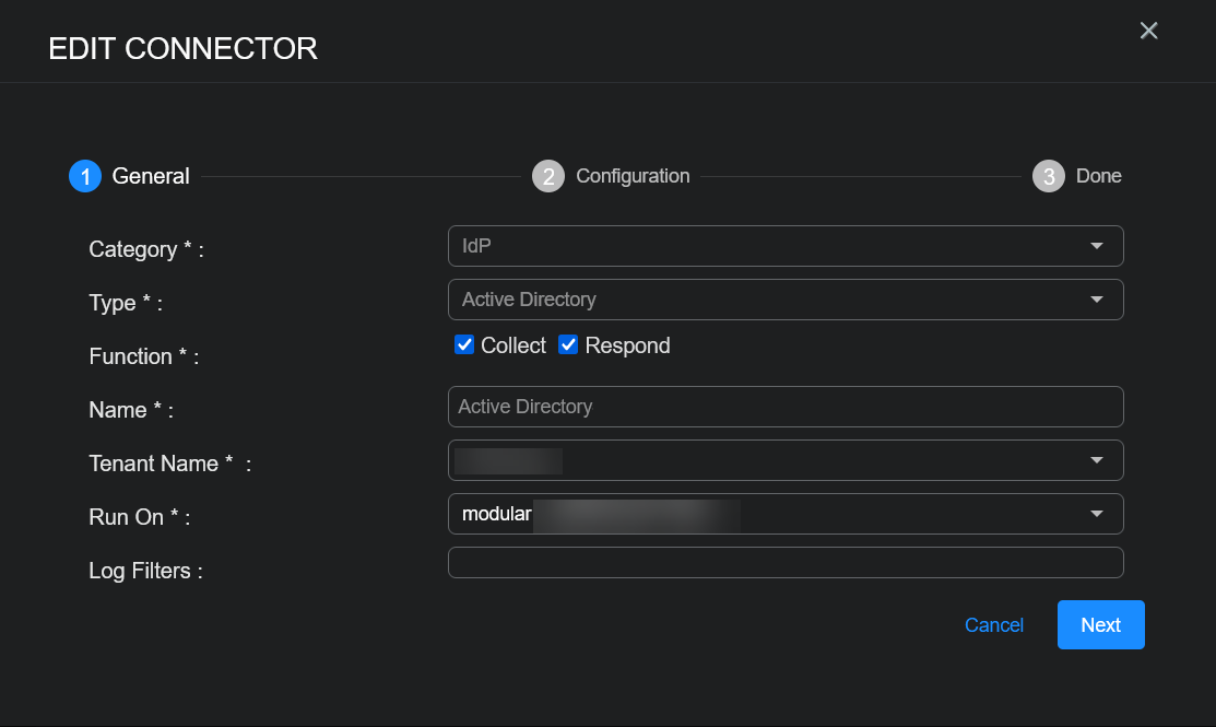 2. Configure the Active Directory connector as described in Configuring Active Directory Connectors. For Function, select both Collect and Respond.