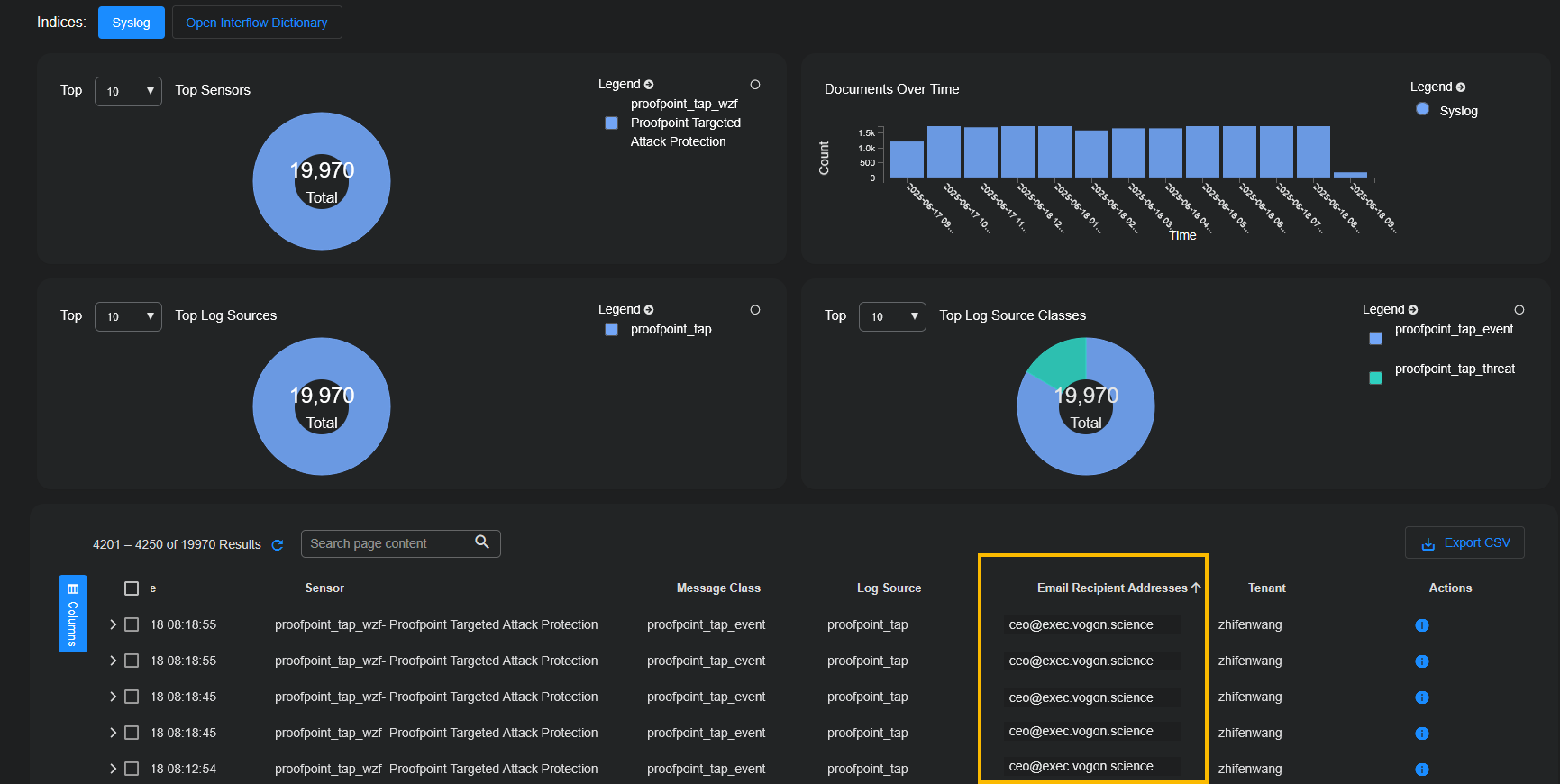 Or you can navigate to Threat Hunting to see the Email Recipient Addresses. You may have to add the column to the table.