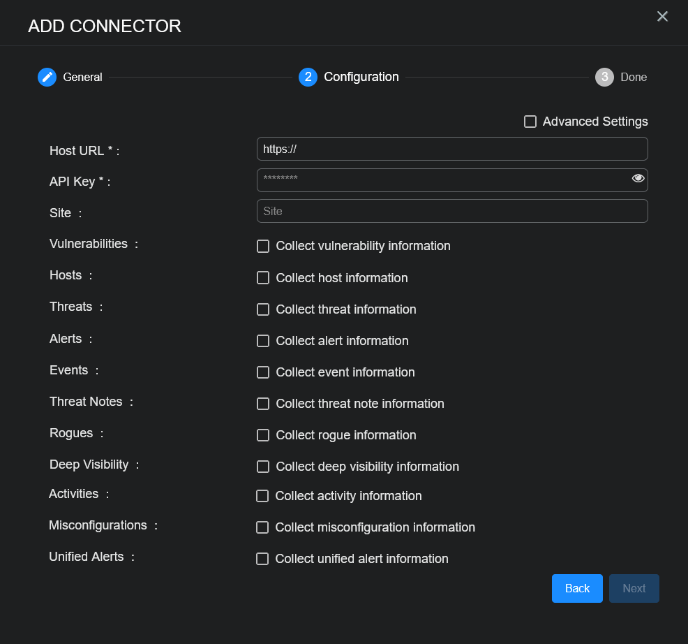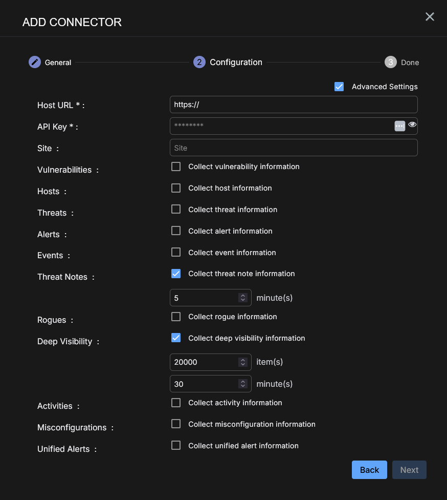 16. Click the Advanced Settings checkbox to enter the interval, in minutes, for each content type selected. The interval is how often the logs are collected. There are default values for the interval, based on the content type. Most content types have a 5 minute default interval, but Deep Visibility has a 30 minute default interval.