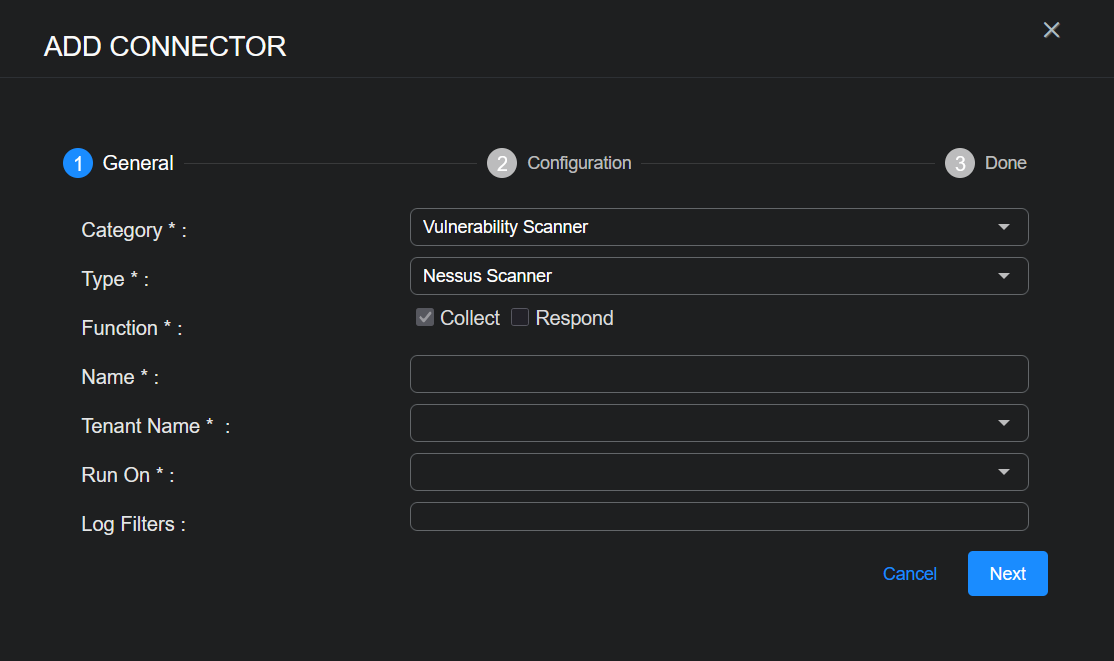 To add a new Nessus vulnerability scanner connector in Stellar Cyber: