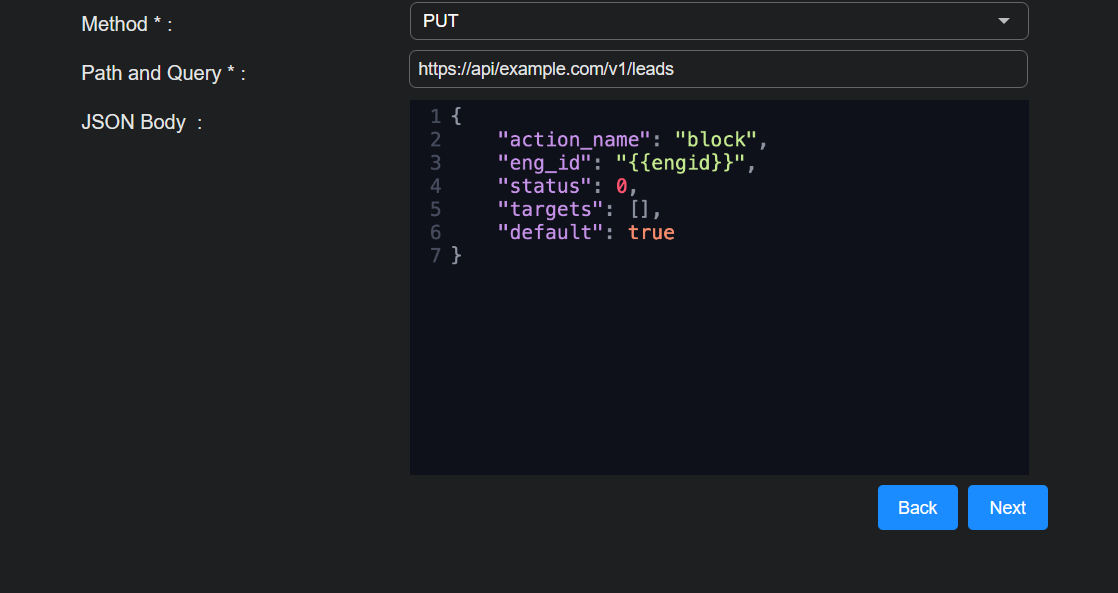 The Universal Webhook Responder can be customized for API integrations with various vendors. Using the Custom type, you can define your own responder. For example, if you want to configure a firewall with a Block IP action, you define an API request for the action.