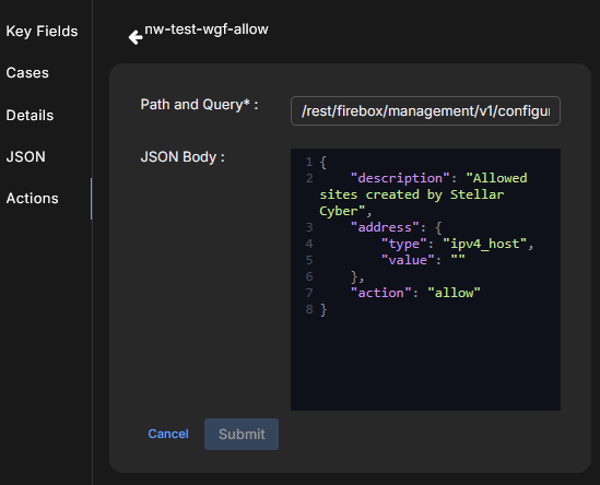 WatchGuard Firebox Responders use Webhook templates that support actions. Each action is one responder, there are two actions, and hence there are two Responders: WatchGuard Firebox Add Allowed Sites and WatchGuard Firebox Add Blocked Sites.