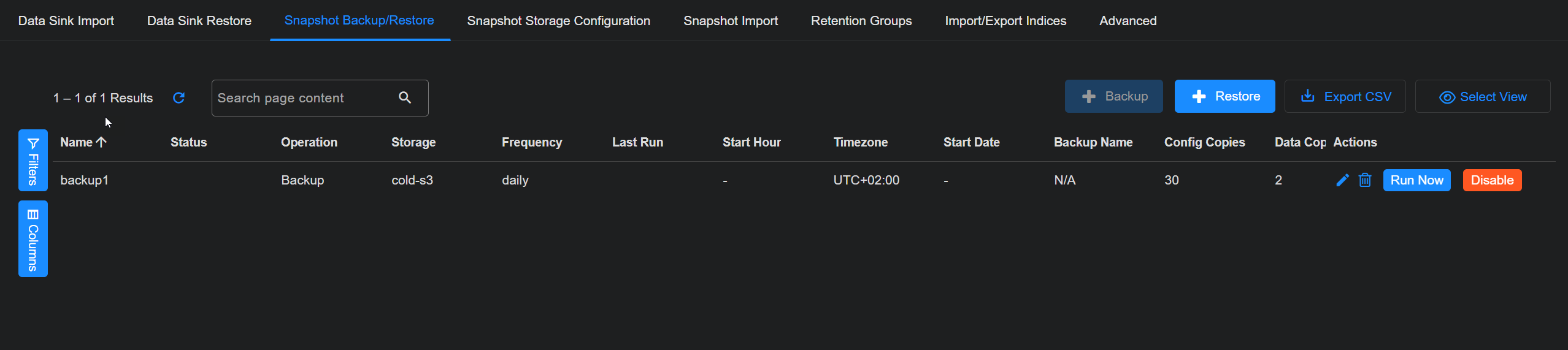The System | DATA MANAGEMENT | Data Management | Snapshot Backup/Restore tab lets you manage snapshot-based backups of data and configuration. You can create snapshot-based backups and restore from them in this tab.