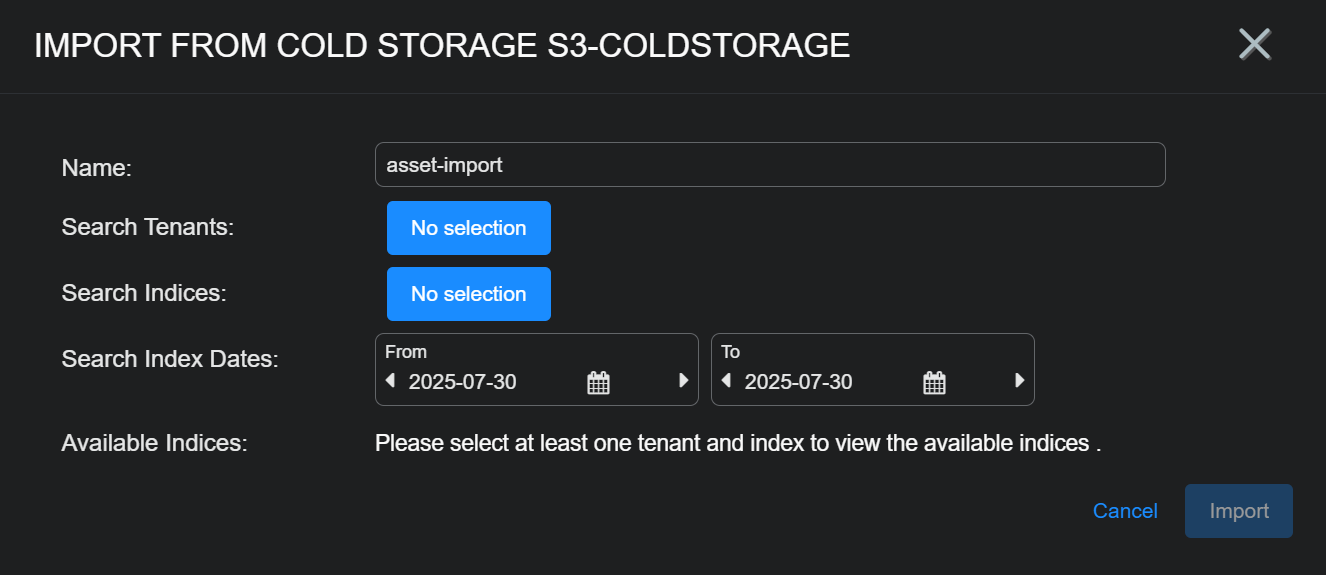 Stellar Cyber can import cold data from either snapshots or a data sink, depending on how you have configured the system. This topic describes how to import data from snapshots stored in a Cold Storage backup configured in the System | DATA MANAGEMENT | Data Management | Snapshot Storage Configuration tab. If you have configured a Cold Storage destination, Stellar Cyber automatically moves stored data to the destination based on your settings in the Retention Groups tab.