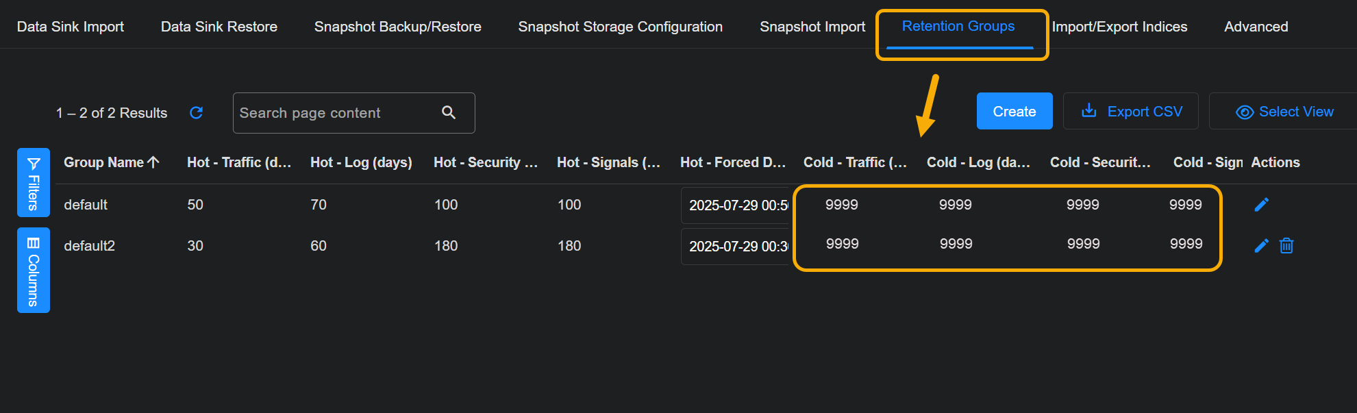Navigate to the System | DATA MANAGEMENT | Data Management | Retention Groups page and use the Edit button for each individual retention group to set the values in the Cold columns to their maximum value of 9999. This failsafe measure ensures that data imported from cold storage is not aged out while performing analysis.