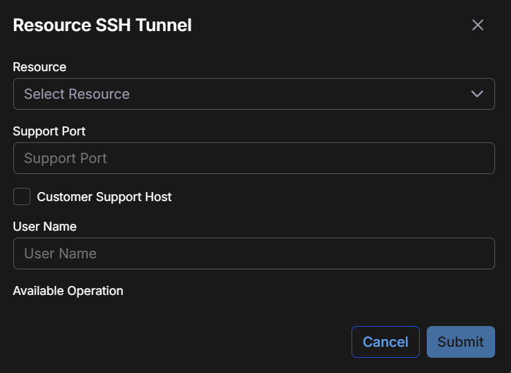 Use this procedure when instructed by Stellar Cyber Technical Support to configure an SSH tunnel for troubleshooting or maintenance. Technical Support will provide the required connection parameters, including the Support host domain name or IP address, port number, user name, and password. When enabled, the selected resource establishes an outbound SSH connection to the designated Support host, creating a reverse SSH tunnel that allows remote access without requiring an inbound firewall configuration.