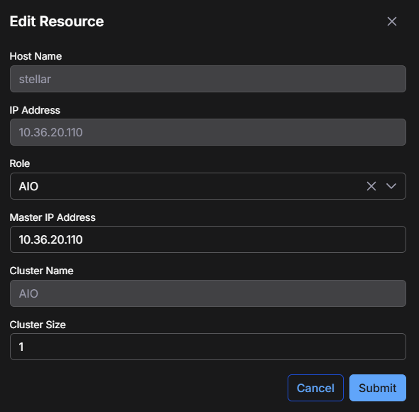 IP Address – (read only) The IP address of the resource that is used within the cluster. It is assigned as part of the installation procedure. This is not the IP address used by the Stellar Cyber user interface.