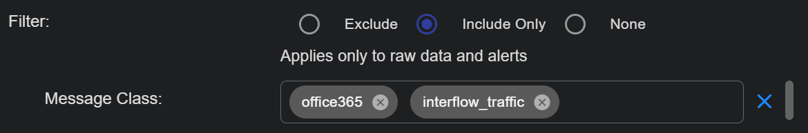 You can use the Filter options to Exclude or Include specific Message Classes for the Data Sink. By default, Filter is set to None. If you check either Exclude or Include, an additional Message Class field appears where you can specify the message classes to use as part of the filter. For example: