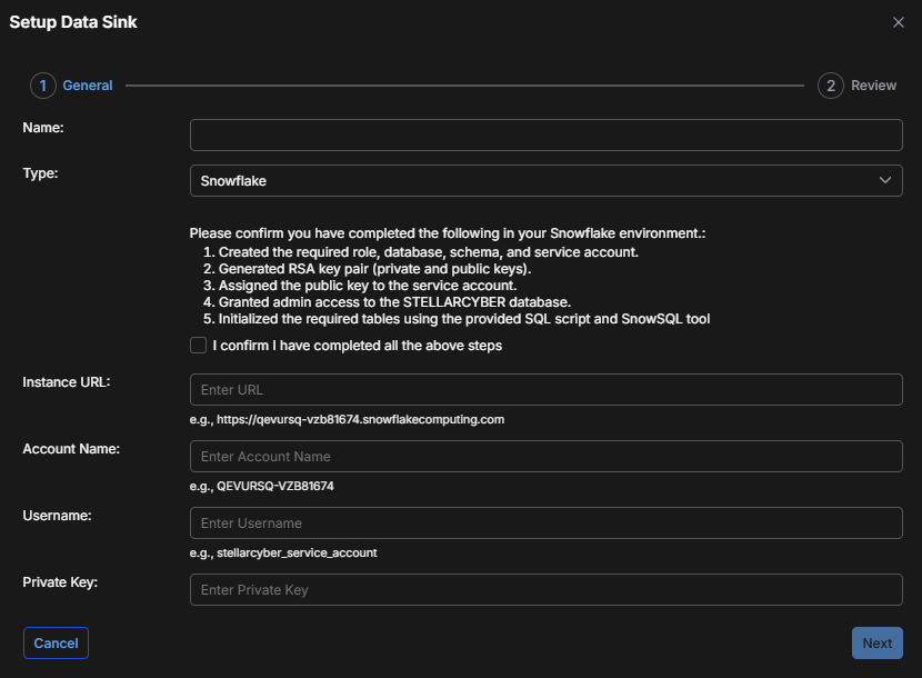 Add the Snowflake Data Sink in Stellar Cyber