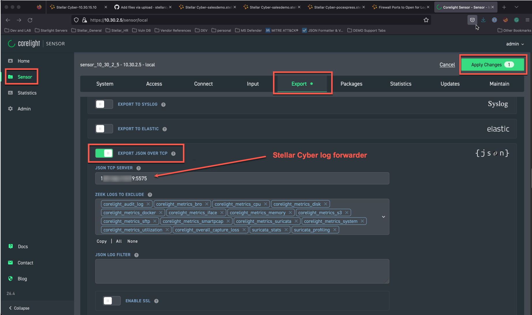 For Corelight Sensor log ingestion, configure Corelight to export to the Stellar Cyber log forwarder IP address and port.