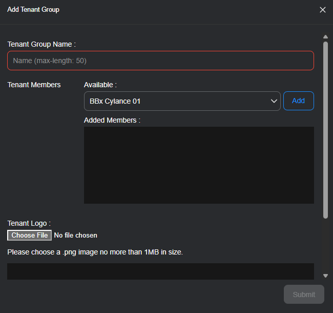 - Select Create to create a new tenant. The Add Tenant Group dialog box (described below) appears.