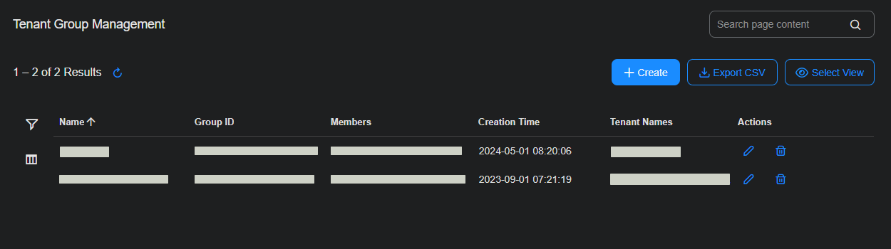 When you select System | ORGANIZATION MANAGEMENT | Tenant Groups, Stellar Cyber displays a table of the existing tenant groups similar to the example below.