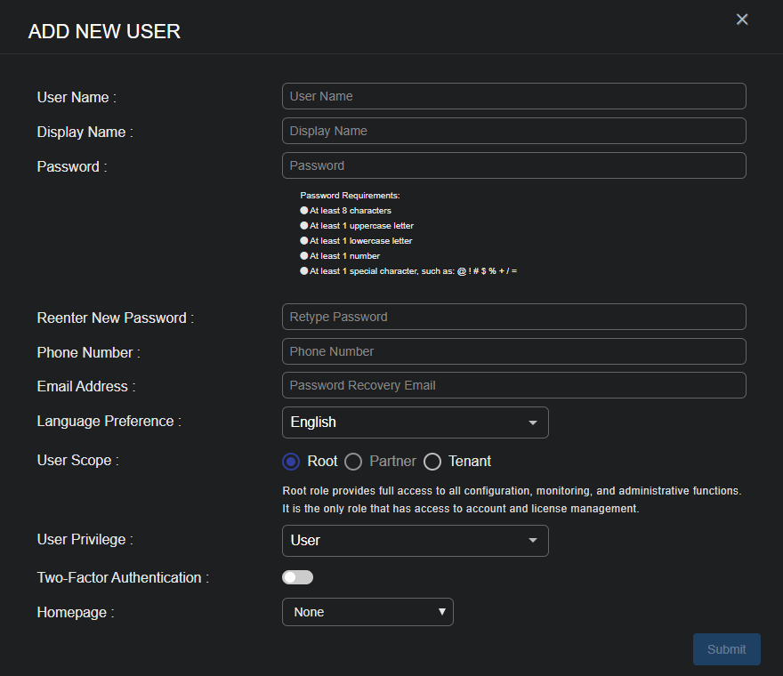 User Scope – Must be Root, Partner, or Tenant.